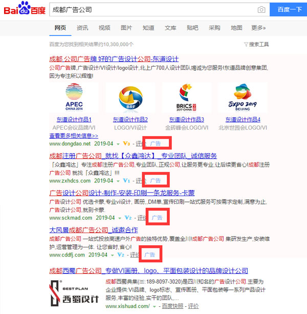 成都廣告公司眾多對(duì)于很多在成都想要做廣告的本土企業(yè)和外來商家來說找哪家來合作呢?現(xiàn)在屬于互聯(lián)網(wǎng)時(shí)代,所以通過搜索引擎也就是百度、360、搜狗等多個(gè)網(wǎng)站來進(jìn)行查找是必不可少的一種途徑。但是大家也知道搜索引擎搜索有太多太多的廣告,怎么樣才能分辨哪些是百度廣告,快速的找到實(shí)質(zhì)的內(nèi)容呢?這里我們四川零貳捌廣告有限公司就以下圖為例讓你明確的了解哪些一看就屬于搜索引擎收錢給你推送的廣告,讓你能完美的避開廣告推送。