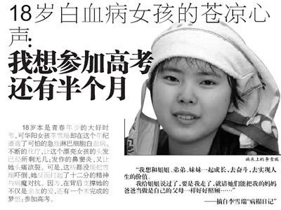 摘自雪瑞“病榻日記”: 知道我為什么回家嗎?我在醫(yī)院待了四個月沒回來過,我在醫(yī)院爸爸天天在家擔(dān)心我,為我到處借醫(yī)藥費,我不想在醫(yī)院,要是我不在了又花了那么多錢我怎么忍心讓都四十歲的父母以后一直為我還債過不上好生活。我爸爸說過,上帝是會眷顧好人的 ! 同學(xué)們都會跟我講學(xué)校的事、學(xué)習(xí)的事,我好羨慕哦 以前覺得這個病離自己的世界很遠,誰知道會落在我身上。上天對媽媽太不公平,給了她一個不太健康的丈夫,又給她一個不太健康的女兒。 一個18歲的女孩,李雪瑞,在即將踏入高等學(xué)府之時,被無情的病魔擊倒了。