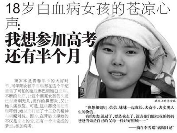 4月中旬,雪瑞堅持回到學校上課,第二天就暈倒在課堂上。隨后一個噩耗襲來:雪瑞患的是急性淋巴細胞白血??! 她失去了上大學的機會,也再次改變了她整個家庭,全家人再次陷入痛苦的深淵。