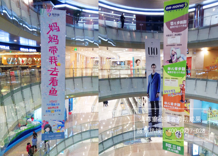 大型商場吊旗制作尺寸一般有(例舉):100*1000cm、100*1200cm、120*1000cm、120*1200cm、150*12000cm、150*1500cm等。