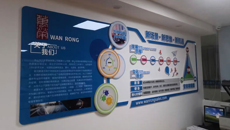 3.在企業(yè)文化墻的設(shè)計(jì)方案和生產(chǎn)制造中,應(yīng)更為留意原材料的挑選。當(dāng)今的文化墻設(shè)計(jì)原材料包含鋁朔板,丙烯酸酯,LED發(fā)亮標(biāo)識(shí)符,不銹鋼板,鋼化夾膠玻璃,舞臺(tái)聚光燈,盆栽及其例如泡罩,漆料和除霉膏等加工工藝。