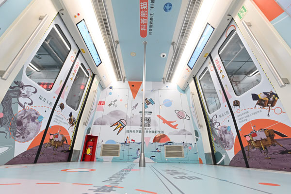 科普熊貓主題列車將分為海洋車廂、天空車廂和陸地車廂。走進(jìn)列車內(nèi),記者發(fā)現(xiàn)這輛車與平時有很大變化,車門、車窗、廣告欄等布置一新,環(huán)顧四周都是主題鮮明、內(nèi)容準(zhǔn)確,圖文并茂、視覺沖擊強(qiáng)烈的科普內(nèi)容。在車門上,還印有與天空相關(guān)的文字內(nèi)容,例如“世界第一枚液體燃料火箭”“航天時代的開始”“神舟一號”等等,觸目皆可獲取與天空相關(guān)的科普知識。