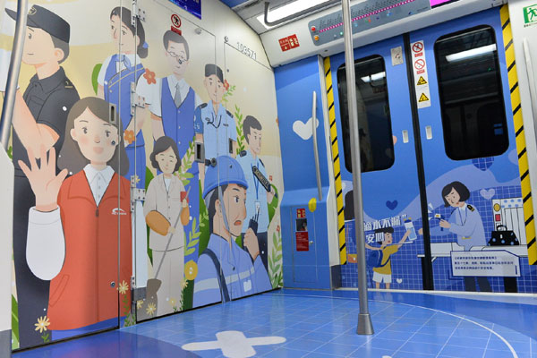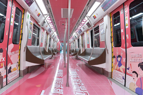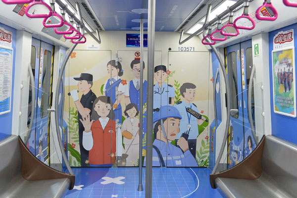 “文明號”主題列車看6節(jié)車廂呈現(xiàn)6種色系:明亮藍、暖黃、葡萄紫、莫蘭迪綠、玫紅、蘋果綠,色彩清新柔和、童趣輕松,可為地鐵族通勤途中增加一絲暖意和愜意。