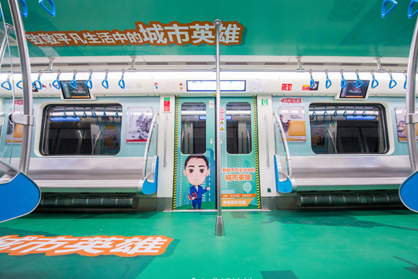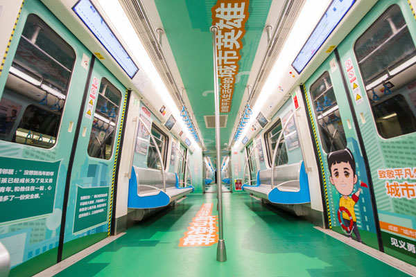 “城市英雄”主題專列由6節(jié)車廂組成,每節(jié)車廂展示不同類別的“城市英雄”,包括助人為樂、見義勇為、誠實守信、敬業(yè)奉獻、孝老愛親以及新時代好少年。