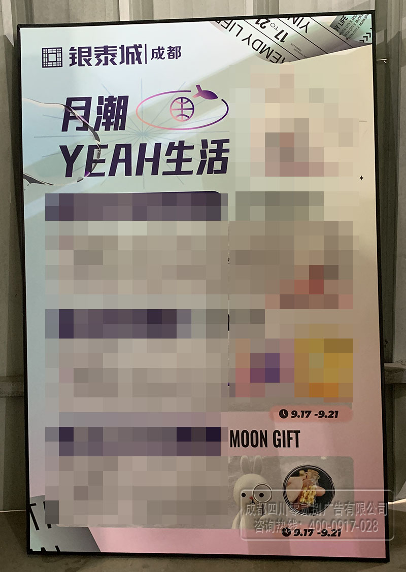 臨近中秋了,中秋節(jié)期間活動(dòng)廣告宣傳的設(shè)計(jì)與制作也在陸續(xù)開(kāi)啟中,圖片為成都銀泰城制作的中秋節(jié)廣告宣傳制作展示,主要采用KT板材質(zhì),UV噴繪圖案字體,設(shè)計(jì)感溫馨。