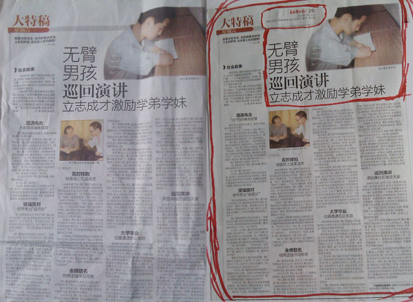 2012年7月14日星期六,華西都市報(bào)第28版大特稿刊登了《無(wú)臂男孩巡回演講立志成才激勵(lì)學(xué)弟學(xué)妹》的文章。在2003年高考完畢,熊仁汀(原名熊仁葛)就被華西都市報(bào)、新華社、成都商報(bào)、成都晚報(bào)、香港文匯報(bào)等采訪報(bào)道了他在9歲時(shí)遭遇電擊,痛失雙臂后,通過(guò)父母、老師、同學(xué)的幫助和自己的努力,戰(zhàn)勝重重困難,重新堅(jiān)強(qiáng)地面對(duì)生活和學(xué)習(xí),靠著堅(jiān)韌的毅力克服了一般人不能克服的種種困難,以高出當(dāng)年本科錄取線51分的好成績(jī)考入了西南石油大學(xué),激勵(lì)了無(wú)數(shù)的學(xué)弟學(xué)妹去實(shí)現(xiàn)他們的大學(xué)夢(mèng)想和人生追求!