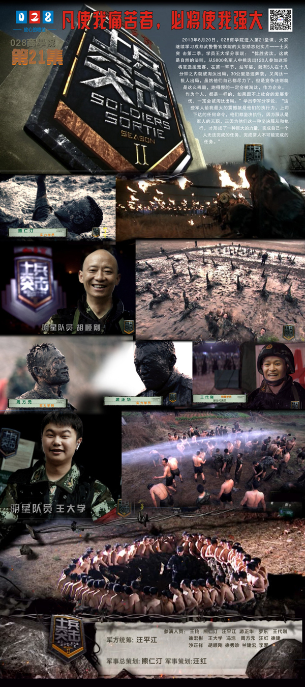2013年8月20日,成都廣告制作028商學(xué)院進(jìn)入第21堂課,大家繼續(xù)學(xué)習(xí)成都武警警官學(xué)院的大型勵(lì)志紀(jì)實(shí)片——士兵突擊第二季。噴繪生產(chǎn)部學(xué)員王大學(xué)分享說(shuō):“優(yōu)勝劣汰,這就是自然的法則,從5800名軍人中挑選出120人參加這場(chǎng)將官選拔競(jìng)賽,在第一環(huán)節(jié),站軍姿,就有5人在十幾分鐘之內(nèi)就被淘汰出局,30公里急速奔襲,又淘汰一批人出局,雖然他們自己都盡力了,但是競(jìng)爭(zhēng)法則就是這么殘酷,跑得慢的一定會(huì)被淘汰,作為企業(yè),作為個(gè)人,都是一樣的,如果跟不上社會(huì)的發(fā)展步伐,一定會(huì)被淘汰出局?!睂W(xué)員李軍分享說(shuō):“這些軍人給我震撼就是他們的執(zhí)行力,上司下達(dá)的任何命令,他們都堅(jiān)決執(zhí)行,因?yàn)榉氖擒娙说奶炻?,正因?yàn)樗麄冞@一種堅(jiān)決服從和執(zhí)行,才形成了一種巨大的力量,完成自己一個(gè)人無(wú)法完成的任務(wù),完成常人不可能完成的任務(wù)。”