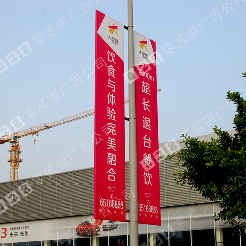 成都道旗制作 道旗又名燈旗桿。一般是指安裝在道路兩旁、活動場館附近的路燈燈桿等物體上的廣告、宣傳媒體。屬于戶外廣告媒體的一種。