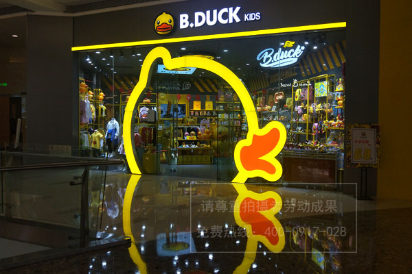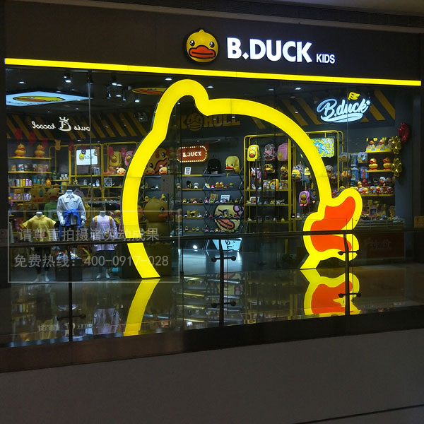 B.Duck kids小黃鴨因?yàn)楫a(chǎn)品超可愛(ài)所以受到廣大客戶(hù)的喜愛(ài),所以在很多的商場(chǎng)都會(huì)有兒童潮牌實(shí)體店的入駐,其門(mén)店裝飾、店面招牌設(shè)計(jì)門(mén)頭發(fā)光字制作方面都特別的新穎。