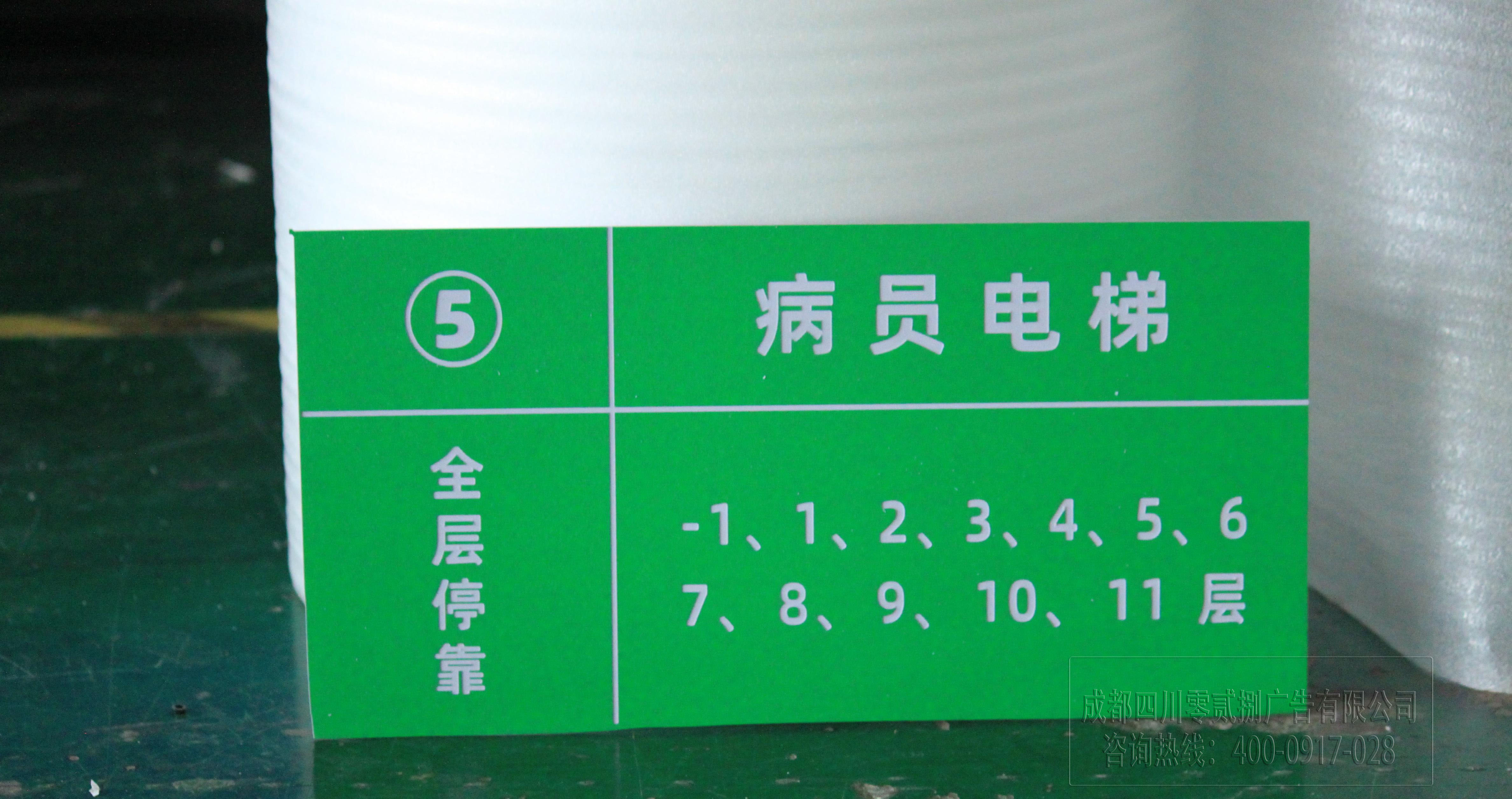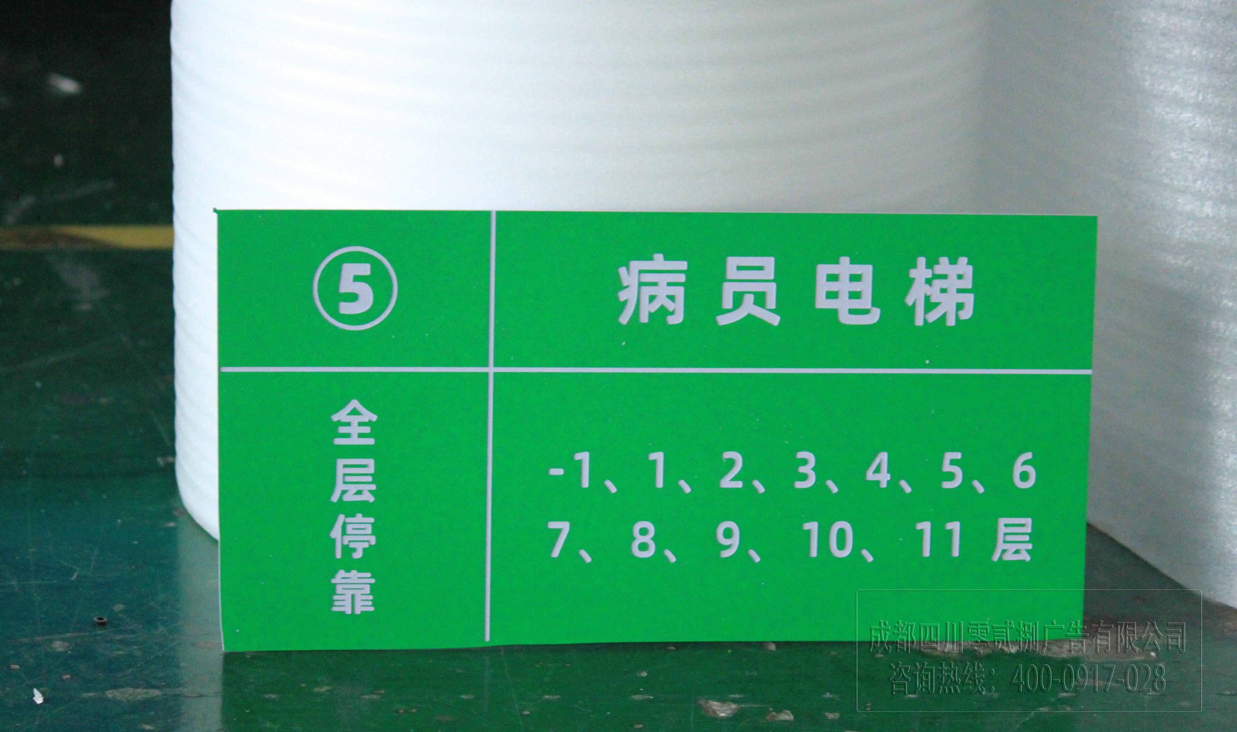 醫(yī)院電梯提示牌就是由噴繪雙色板制作而成,固定不會(huì)影響美觀(guān)。圖片為028廣告公司加工而成,需要做大型指示牌、樓層套組指示牌、醫(yī)院、學(xué)院等等指示牌都可制作!