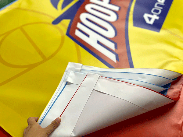 雙噴布,也叫夾黑布。品質(zhì)通常的雙噴布常使用普通布夾黑,而高端的雙噴布常使用刀刮布夾黑。不管哪一種布都有良好的遮光效應,可雙面彩印。通常用于市場天井的小型懸空掛畫、街道兩側(cè)的雙面旗幟展示。