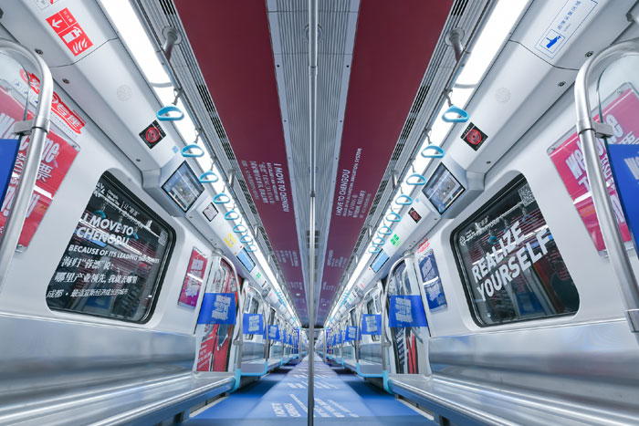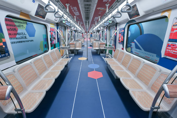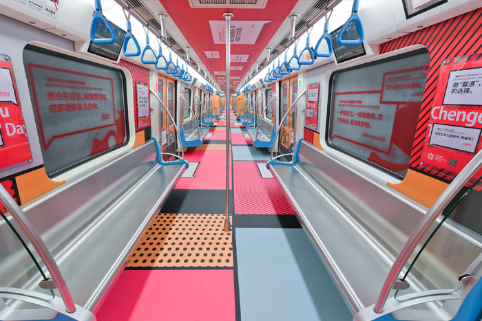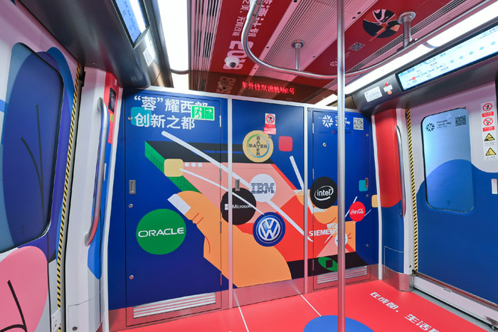 在視覺風(fēng)格上,據(jù)主題列車設(shè)計(jì)單位——東道品牌創(chuàng)意集團(tuán)介紹,地鐵10號(hào)線作為向中外游客展示成都形象的一扇窗口,主題列車“創(chuàng)新之都,‘蓉’我圓夢(mèng)”采用“‘蓉’耀西部,創(chuàng)新之都”“‘蓉’合之美,無限可能”兩大主題,力圖凸顯成都獨(dú)特的城市魅力,車廂設(shè)計(jì)以簡(jiǎn)約、國(guó)際化的插畫形式,采用紅色和藍(lán)色兩種主色調(diào)。