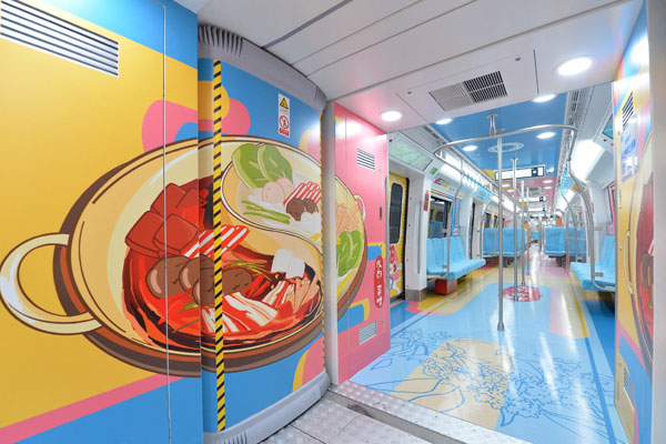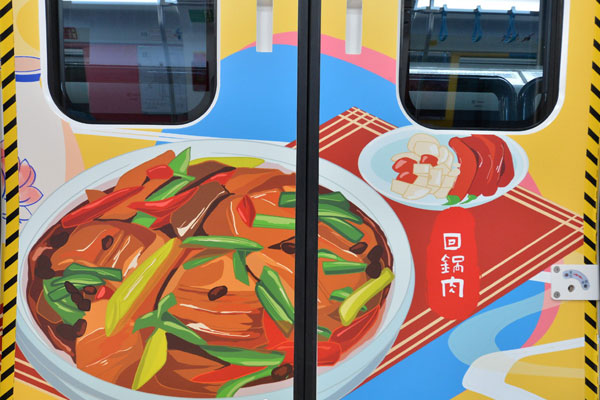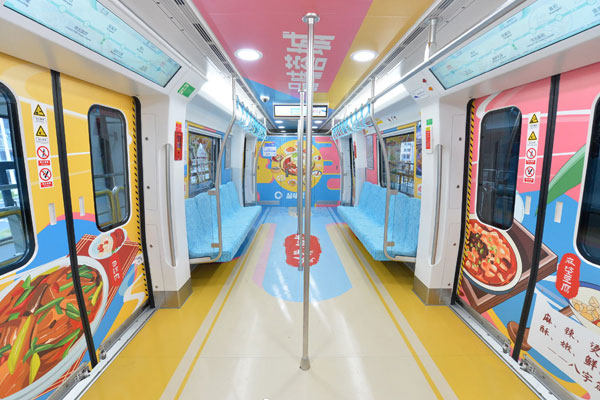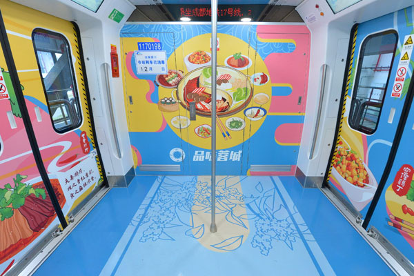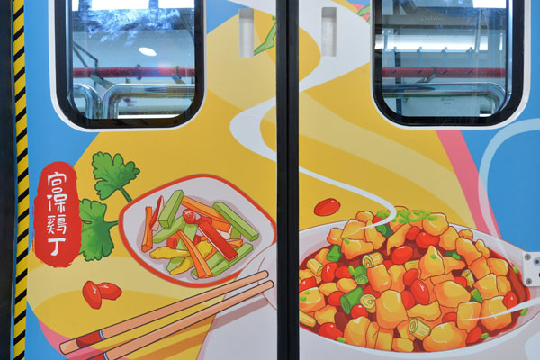 來(lái)啦!城市文化主題,將8節(jié)車廂劃分成蜀址、蜀遺、蜀樂、蜀味4大板塊,成都軌道交通17號(hào)線主題列車旨在展示成都悠久的城市歷史和多彩的民俗文化?;疱仭⒒劐伻?、麻婆豆腐宮保雞丁…感覺會(huì)越坐越餓