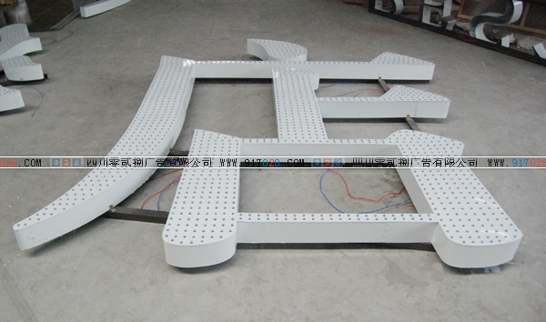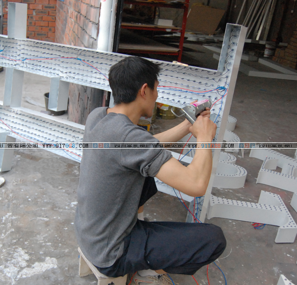 四川雙流028噴繪公司制作的單孔外露發(fā)光字,正在進行安燈作業(yè)。
